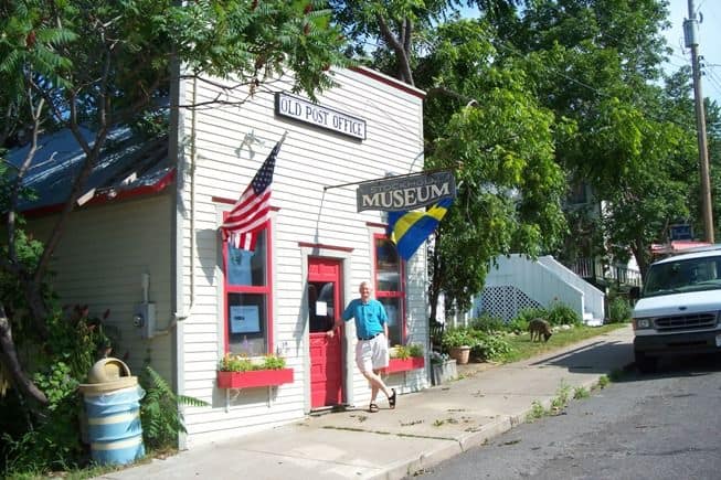 My grandfather, also named Eric Johnson and also married to [a different] Anna, was born and grew up on the farm near Stockholm, but then moved to North Dakota and later to Alberta. Also born nearby (<10 miles) in my great-grandfather’s time was Laura Ingalls Wilder, in 1867, the author of the Little House series of books and the best-known person from the area. Her birthplace cottage is restored, and there is a museum in nearby Pepin. The towns of Stockholm and Pepin are on the shore of Lake Pepin, a widening of the Mississippi River, with dramatic bluffs above Stockholm overlooking the broad valley. There are family stories about crossing the lake on the ice in the winter to the Minnesota side. Nowadays Stockholm is a tourist town, especially on summer weekends, with arts and crafts shops and an official population of 97. One of the shopkeepers told us about a well-known local event on Tuesday evenings in summer, pizza night, when an organic farm near town bakes pizza in an outdoor wood-fired oven and people picnic on the lawn. There’s no advertising and not even any signs, but it was easy to find. Nils and I didn’t come prepared for a picnic, but we did get a pizza and made the best of what we had in the car: