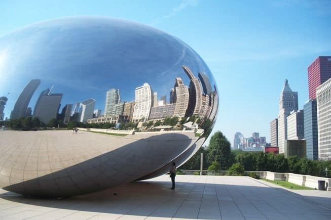 So early this morning Nils and I got up and drove halfway out to O’Hare to leave the car and ride the Blue Line train back downtown. We walked home through Millennium Park and took a photo by the Cloud Gate, popularly known as The Bean: