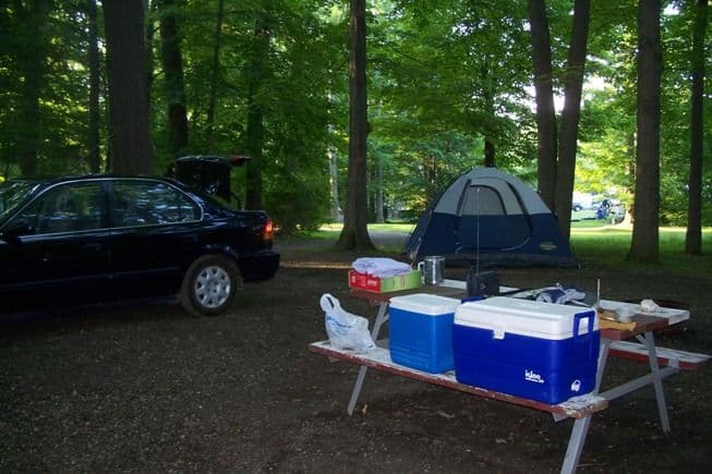 I left the concert early so I could set up my tent before dark, and by the time I brushed my teeth I needed a flashlight to walk back to my tent so I went right to bed around 10:00. It was my least satisfying night camping out so far. Some previous camper had left a bag of trash near my site, and raccoons or some other scavenger tore into it in the night. And I had a mosquito in my tent, maybe more than one since I heard it buzzing around my ear three times. Then at 2:30 I woke up to some sprinkles and got up to put the fly over my tent – I’ve been sleeping without, and just open screen for half the tent overhead. I’d done this exactly once before, when I did a test set before leaving home, but I’m pleased to say I managed to put its ridgepole in place and tie it all down without even using a flashlight. I got back in bed before much rain fell, but when I heard a peal of thunder that rumbled on for 20 seconds I thought oh no, here comes a downpour. But it didn’t, and just sprinkled for a while. After that I got a good sleep until it got light around 6:00. Things improved from there. I got up and had a nice hot shower, got a pot of coffee on to perk, and found NPR on the radio. It was quite a nice morning, not hot and sticky like down south, so I enjoyed eating my grapefruit and granola outside, and fortunately the tent was dry enough to pack up: