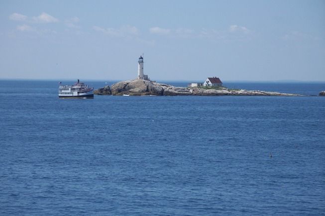 The first time I went, I thought “Why so many old people?” Now I feel like I fit right in, although one of the appealing things about Star Island is the many families who come, some bringing grandchildren. We took our daughter and son-in-law in 2005 and tried to take our son and daughter-in-law in 2007, but the IRAS conference last year was cancelled at the last minute so the 4 of us took a driving vacation aound New England and the Maritimes instead. I was reminded of this when I watched the tour boat go past Star Island this year, passing in front of a nearby island with a lighthouse: