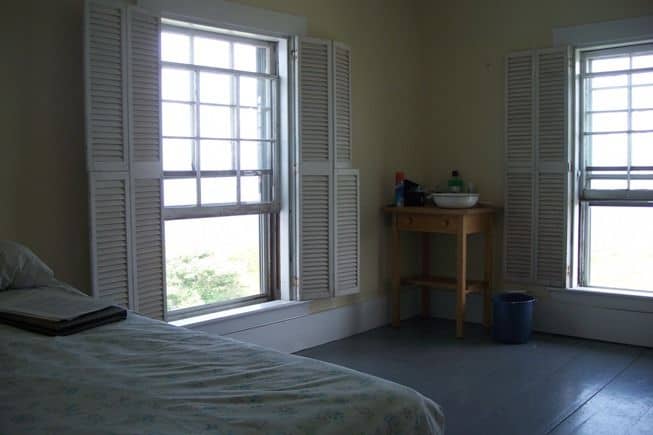 My room was in the main hotel, on the far right of the picture, on the 3rd floor (just below the eaves), a corner room with windows facing both ways. I don’t know what I did to get such an exceptionally good room, and the stairs helped me keep in shape, even carrying up hot water since there is none in the room, just a washstand and basin:
