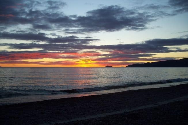 Rainbow Falls was a nice campsite, but just a few minute after I got my tent up it started to rain. And not just a little, it poured, and showered on and off until after I went to bed around 10:00 pm. Before the rain I went down to the shore to lie on the granite outcrop and read, but the rain started before I even finished a paragraph. I decided since camp was wet I’d go find a place to eat, and was surprised to find a fine restaurant nearby, Serendipity in Rossport (http://www.serendipitygardens.ca/cafe.html). I had a nice meal of lake trout, and blueberry shortcake for dessert. The weather cleared overnight, but the tent was still wet when I packed up, so I thought it would be good to use it again soon and dry out. I bypassed several provincial parks, figuring there are thousands of lakes but only one is Superior, so I drove to a campsite in Lake Superior provincial park at Agawa Bay (http://www.lakesuperiorpark.ca/), and with clearing weather watched a beautiful sunset over the water: