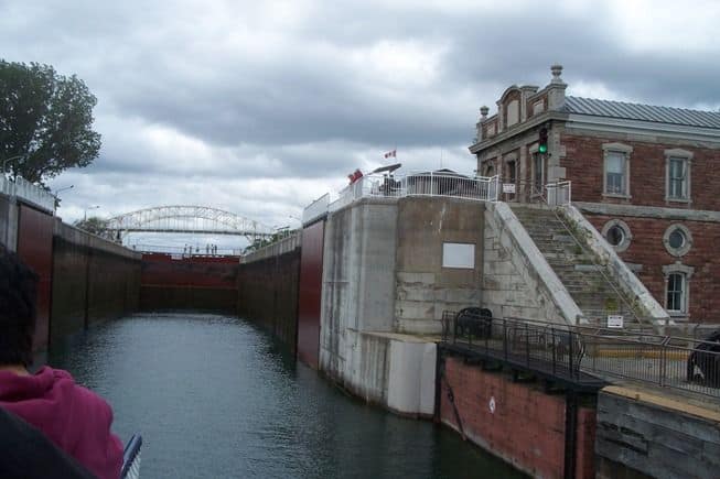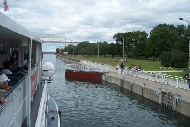 Then this (Sunday) morning I drove into the city of Sault Ste. Marie, and went on a tour boat through the locks connecting Lake Huron with Lake Superior, a lift of 21 feet: