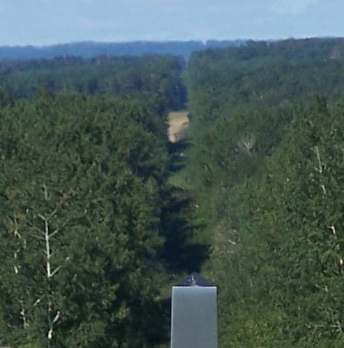 I took the picture above standing on the border, and only noticed later that it shows a phenomenon I’ve remarked on before, that at this latitude the curvature of the earth is noticeable because east-west lines, like the 49th parallel, bend north. You can see the distant notch of the border cutline is offset quite a bit to the right (north) in the photo.