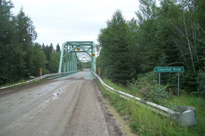 By then it was raining, and I thought if I was going to drive in the rain I wanted to get somewhere, and decided that I could make it to Buffalo Narrows before evening. So I set out westward along a 100 mile gravel road that turned out to be even worse than I expected. Based on what I’d driven north of La Ronge, I figured I’d average 45 mph and take less than 2 ½ hours, but it took 3 hours, and the road got worse as I went along. I should have taken a picture of my mud-drenched car when I finally got back to pavement, but I was too frazzled from all that difficult driving to even think of photography. Fortunately, I found a nice motel room in Buffalo Narrows, overlooking the bridge across the narrows which give the town its name, separating Peter Pond Lake and Churchill Lake: