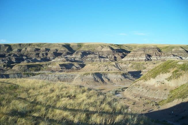 I drove back roads, including a ferry crossing of the South Saskatchewan river, to Oyen, Alberta, where my mother’s family moved when she was 7, and went from a German-speaking parochial school to English. I carried on and camped for the night in Drumheller, after visiting the Royal Tyrell Museum in the “badlands” where many dinosaur skeletons have been found: