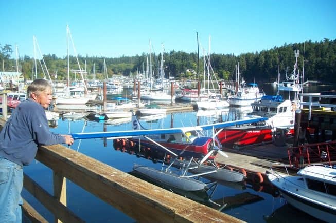 It’s a Pietenpol Air Camper, built from drawings originally published in 1932. He started building about 30 years ago, and had only about 6 flying hours since he’s still making adjustments. But I got to see two flights which upped its time by 50%. I don’t think I’d have the patience for such a project, but it is impressive to see someone who built model planes in our student digs do something like this. He lives on Salt Spring Island, and works on boats at Ganges harbor, a picture postcard place: