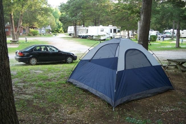 Next I lost my faith in GPS navigation. I put in “navigate to Mountain View” and it took me down some dirt road that first looked like it was being improved, so I went on expecting a nice shortcut. After about 3 miles down some logging road I came to a stream that would have needed a truck to ford, so I turned around and went back to Murfreesboro to try again, and I checked the GPS details carefully before trusting it again. With the half hour backtracking and 5 hour drive it was after 6:00 when I got to Mountain View, where I wanted to see the Ozark Folk Center. It’s a state park without campsites, but the book said camping nearby so I drove around and saw only RV parks. I tried one, Whitewater RV Park, and they had a really good deal for tenting, just $10 (plus tax) for a site with no electricity (that would have been another $3) and a bathhouse with hot water and showers. That sure felt good after 2 days on the road. A lot less scenic than my Caddo campsite, but a lot more practical, and an even better deal for only $2 more with hot water and showers.