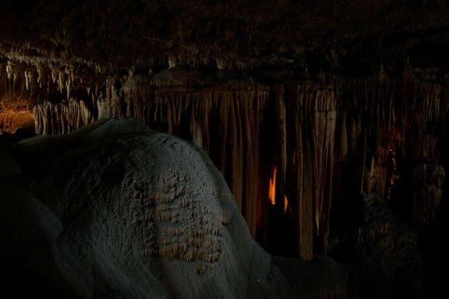 I had a good sleep, good weather but hot even with all the open screen on my tent. The RV park had free wireless Internet, so after I had my breakfast and packed my car I spent an hour or so doing email. Then I headed off in the rain (I’m glad that didn’t start until the tent was packed) to Blanchard Springs Cavern, a state park but the cavern operated by the National Forest Service. I was attracted to Mountain View and the caverns because we’d visited before in 1986 when we took a family vacation from Houston to Arkansas. The cavern has two tours, the easy more scenic one which I expect we took 22 years ago with the children, and a longer one, 1 hour 40 minutes with 700 steps, which I took. And I got to use my rain suit, not for wet but for cold in the 58 degree underground air. Unlike many caves, this one lets you take photos: