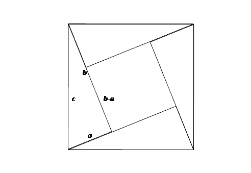 Then on March 24, 2006, I was reading the Wall Street Journal at lunch and saw on the front page a diagram headed "Pythagoras's theorem a2 + b2 = c2 (From the Encyclopedia Britannica entry for 'Pythagoras')" and showing a square subdivided into two smaller squares and two rectangles each with a diagonal to make right triangles with sides labeled a, b, and c (see Appendix). The text of the article, about the relative merits of the Encyclopedia Britannica and Wikipedia, didn't provide further explanation, and I was left wondering how the diagram demonstrated the theorem. I couldn't see the idea behind the diagram, but afterward in my office I tried to remember how to prove the theorem, and whether I could recall or construct a simple diagram that would prove the theorem. Inspired by the diagram in the article, I started to sketch diagrams with 4 triangles in a square, and quickly came up with a diagram like this: