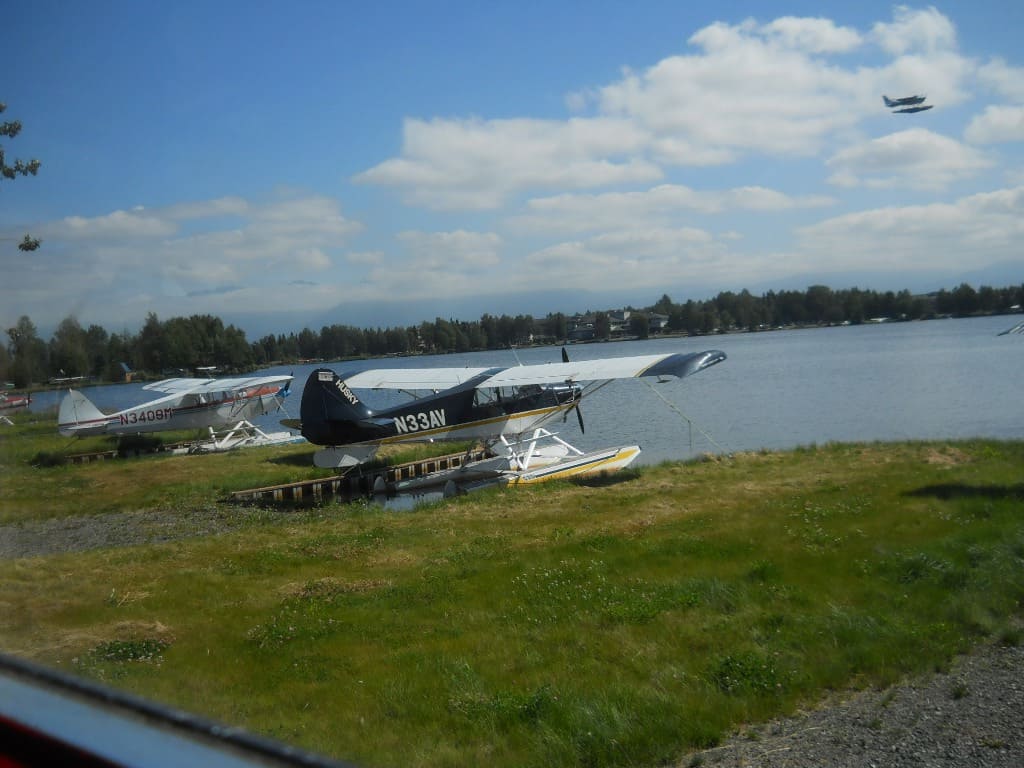 From Denali we continued south to Anchorage, on the Pacific coast and Alaska's largest city. I was most impressed with the float plane base, with hundreds tied up at docks, mostly small single-engine aircraft [photo]. We had a great seafood meal at the Bridge restaurant over Ship Creek, but our touring enthusiasm was on the wane with the big events behind us, so we were happy to head for home after staying a couple nights, and again bypassed Tok [photo] to cross the border and stay at Beaver Creek, Yukon. Here we had the opposite experience from arriving in Alaska via the Top of the World Highway -- a long wait for Canada Customs and the road going from smooth and swift to choppy frost heaves and potholes on the Alaska Highway. Beaver Creek bills itself as the most westerly community in Canada, with really no other attractions than a place to sleep. The road got better as we passed by Kluane National Park on the way to Whitehorse, with an afternoon stop at Takhini Hot Springs so I could revisit the place my parents took me in 1956 (disappointing).
