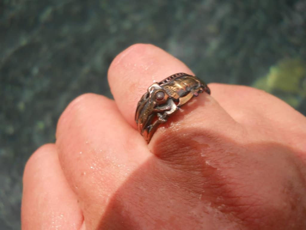 On the way back we tried to revisit highlights as well as hit a few places we hurried by on our way up, like the museum in Teslin where a trapper had bought a car before there was a road. We stayed again at the Northern Rockies Lodge on Muncho Lake, after another dip in the Liard River Hot Springs, a great spot which is as memorable today as I remembered from 1956. I discovered it's an alchemist's dream, turning silver into gold. After 20 minutes in the hot mineral water I noticed that a silver ring I was wearing had turned gold [photos silver, gold]. The effect was quite striking, at least to me, and I hope the other pool visitors I showed it to didn't just think I was weird. From Muncho Lake we drove all the way back to Mile Zero [photo] in Dawson Creek the next day and overnighted with my brother before the short trip back to Rycroft on August 3, 17 days after we left.