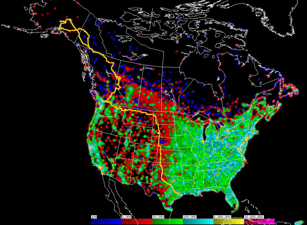 The map shows my/our route in yellow, with outlines of the states and provinces, and background color for population. The population is from census data with each cluster spread over a 20 mile radius, and the colors are in bands representing orders of magnitude, each 10 times as many people as the band before, so red areas have about 1 to 8 people per square mile and green about 8 to 80 (see my Census page for more details), and any town with more than 10,000 people will be green (or light blue, yellow or purple for larger cities). There are many areas in the west where census tracts are bigger than 20 miles, so my map has dots with 20 mile radius surrounded by black. I would have liked to drive through these areas, but they are mostly mountainous and without straight roads, so I chose the high plains.